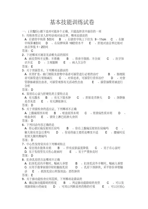 基本技能训练试卷一、(共52分)题下选项可能多个正确,只能选择其中最佳的一项1、均称体型正常人肝叩诊相对浊音界,哪项是错误的A、右锁骨中线第5肋间B、右锁骨中线上下径为9~11cmC、右腋中线第8肋间D、右肩胛线第10肋骨水平E、肝绝对浊音界比相对浊音界低1~2肋间答案:C2、下述哪项不属常见诊断失误的原因A、病史资料不完整、不准确B、体查不细致、不全面C、医学知识不足D、主观臆断E、病人欠合作答案:E3、关于胃插管术,下列哪项是错误的A、在胃扩张、幽门梗阻及食物中毒者可插管进行必要的治疗B、肠梗阻者可插管进行胃肠减压C、对昏迷者,可插管行营养治疗D、对食管静脉破裂出血者,可插管观察有无活动性出血E、插管抽吸胃液进行分析答案:D4、鉴别右心衰与肝硬化的主要特点是A、有无腹水B、有无下肢水肿C、肝脏是否肿大D、颈静脉是否充盈E、有无脾脏肿大答案:D5、关于胃镜检查的适应证,下列哪项不正确A、上腹痛原因未明B、呕血原因未明C、胃溃疡性质未明D、咯血查因E、锁骨上淋巴结肿大查因答案:D6、下列问诊内容正确的是A、你心前区痛反射到左肩吗B、你右上腹痛反射到右肩痛吗C、解大便有里急后重吗D、你觉得最主要的是哪里不适E、腰痛时反射到大腿内侧痛吗答案:D7、中心性发绀常具有下列哪项特点A、常出现在肢体末梢B、伴有皮肤温度降低C、见于右心衰时D、见于发绀型先天性心脏病时E、见于严重休克时答案:D8、扪查乳房的方法哪项不正确A、扪查乳房内半侧时,嘱病人举臂B、扪查乳房外半侧时,嘱病人垂臂C、应用手指掌面循序轻轻触按乳房D、乳房下部肿块,采平卧位举臂触诊 E、抓捏乳房以利鉴别良、恶性肿块答案:E9、关于肺功能检查应用范围,下列哪项是错误的A、确定肺功能障碍的程度B、判定肺功能障碍的类型C、可以发现肺部较小的病变D、可用以判断某些药物的疗效E、可以区别心源性和肺源性呼吸困难答案:C10、下述哪项不属诊断思维的注意问题A、现象与本质B、主要与次要C、临床表现与主诉D、局部与整体E、典型与不典型答案:C11、诊断心房颤动最重要的证据是A、出现异常的P波B、P波消失C、QR间期不规则D、QRS波群形态不一致E、心室率快答案:B12、有关纤维支气管镜检查,下列哪项不正确A、术前应禁食4~6小时B、术前应做X线胸片检查C、术前均应做肺通气功能检查及血气分析D、术前半小时注射阿托品及苯巴比妥E、术后应禁食2小时答案:C13、气管切开术后出现广泛皮下气肿,最简单的处理方法是A、抽吸气体B、松解伤口缝线C、更换气管套管D、让其自行吸收E、局部冷敷答案:B14、下列穿刺部位,哪项不正确A、股静脉穿刺点在腹股沟韧带下方紧靠股动脉外侧0.5cm处B、颈内静脉穿刺在颈部中段,颈总动脉外侧刺入C、颈内静脉穿刺,在胸锁乳突肌锁骨头、胸骨头与锁骨形成的三角区顶部刺入 D、锁骨下静脉穿刺,在右锁骨下缘中点或内中1/3或外、中1/3交界处刺入 E、动脉穿刺常选用股动脉、肱动脉或桡动脉答案:A15、病理反射的出现是由于A、脊髓反射弧的损害B、神经系统兴奋性增高C、脑干网状结构损害 D、锥体束受损 E、基底节受损答案:D16、口对口人工呼吸时,将病人头部后仰,托起下颌,最主要的目的是A、保持脑血液供应B、便于口对口接触C、避免口、鼻分泌物流出 D、解除舌后坠造成的咽阻塞 E、有利于保护颈椎答案:D17、皮肤检查描述哪项不正确A、皮肤黏膜出血,形成红色或暗红色斑,压之不退色B、皮肤黏膜出血,不高出皮肤,<2mm者,为出血点C、荨麻疹呈苍白或片状发红改变,不突出皮肤表面 D、皮肤黏膜出血,高出皮肤,有波动,>5mm为血肿 E、皮肤有小红点,高出皮肤表面,压之退色者为丘疹答案:C18、一侧瞳孔直接对光反应消失,间接光反应存在,病变在A、同侧动眼神经B、对侧动眼神经C、同侧视神经D、对侧视神经E、视交叉答案:C19、检查发现病人胸廓的前后径等于横径,肋间隙增宽,应考虑为A、扁平胸B、鸡胸C、正常胸廓D、漏斗胸E、桶状胸答案:E20、在鉴别阵发性室上性心动过速与阵发性室性心动过速时,以下哪项对阵发性室性心动过速的诊断有肯定的意义A、心室夺获及室性融合波B、QRS波群宽大畸形C、频率200次/minD、T波与QRS波群方向相反E、以上都不是答案:A21、诊断急性心肌梗死最重要的心电图表现是A、病理性Q波或QS波B、ST段弓背向上型上移C、T波倒置D、对应导联ST段下移E、多发室性期前收缩答案:A22、下列哪项禁做骨髓穿刺A、显著血小板减少B、粒细胞缺乏症C、重度贫血D、血友病 E、恶性组织细胞病答案:D23、清创术下列操作哪项是错误的A、伤口周围油污应用松节油擦去B、伤口周围皮肤用碘酊、乙醇消毒C、切除失去活力的组织和明显挫伤的创缘组织D、深部伤口不宜再扩大E、用无菌生理盐水或过氧化氧冲洗伤口答案:D24、有关气管切开术,下列哪项不正确A、病人取仰卧位,肩垫高、头后仰、颈伸直B、皮肤切口从环状软骨下缘至胸骨上切迹稍上方 C、根据气管环为白色、触之有弹性、穿刺抽出气体来辨认气管 D、自2~3环正中切开气管壁 E、下呼吸道分泌物阻塞,不适宜做气管切开答案:E25、一咯血病人,胸片示右上肺阴影,首先应考虑的诊断是A、肺癌B、肺炎C、肺不张D、肺结核E、肺脓肿答案:D26、控制性给氧的浓度为A、<20%B、24%~35%C、35%~40%D、40%E、<50%答案:B27、成人胸外心脏按压,下列哪项