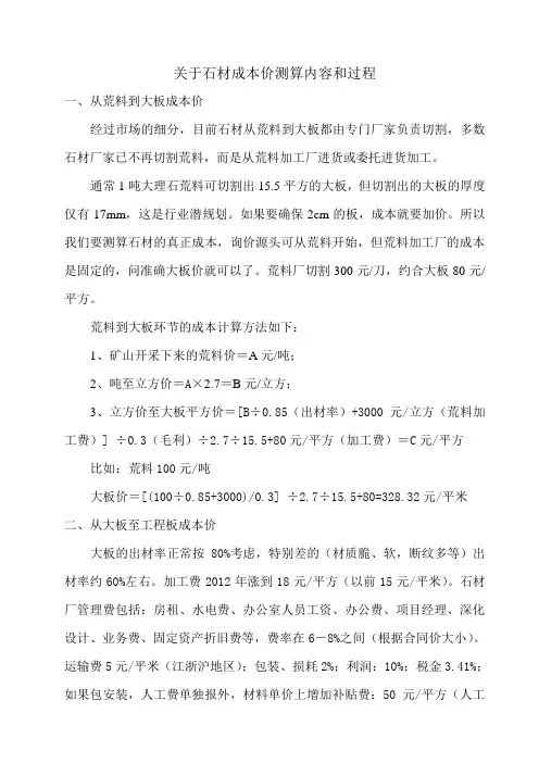 二、原材料成本1. 石材原材料采购异型石材的原材料主要为大理石、花岗岩等天然石材。