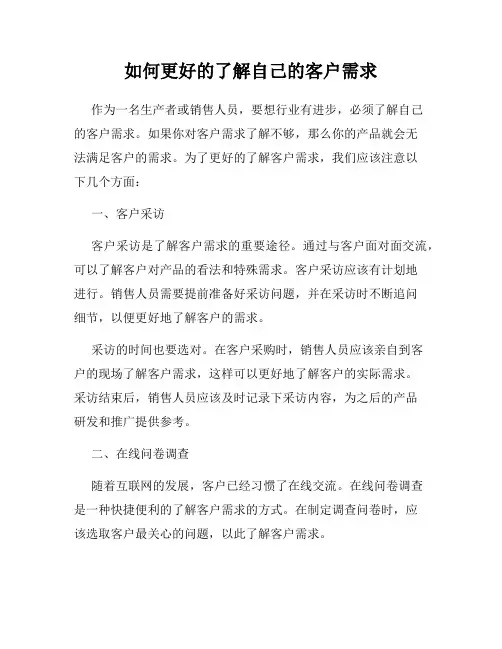为了更好的了解客户需求,我们应该注意以下几个方面:一、客户采访客户采访是了解客户需求的重要途径。