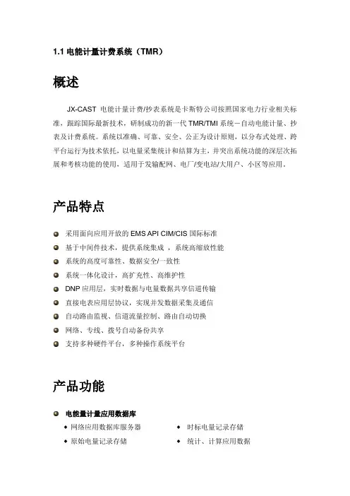 1.1 电能计量计费系统(TMR)概述JX-CAST电能计量计费/抄表系统是卡斯特公司按照国家电力行业相关标准,跟踪国际最新技术,研制成功的新一代TMR/TMI系统-自动电能计量、抄表及计费系统。