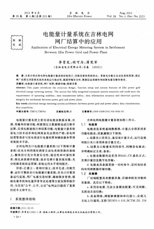 1.1地区电能量计量系统的作用按照国家电力监管委员会下发《电力市场技术支持系统功能规范》(试行)的要求,电能量计量系统是对电能量数据进行自动采集、远传和存储、预处理、统计分析,以达到支持电力市场的运营、电费结算、辅助服务费用结算和经济补偿计算等功能。