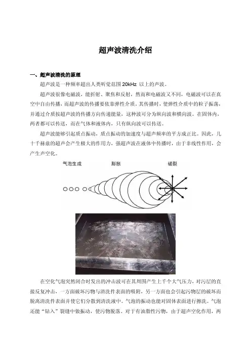 二、超声波清洗的原理超声波清洗的原理主要包括超声波的产生和超声波对物体的作用两个方面。