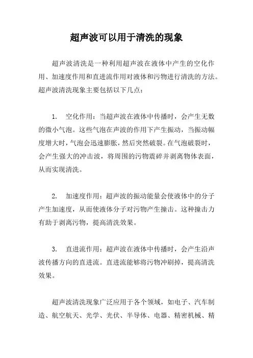2. 超声波清洗的应用超声波清洗广泛应用于以下几个领域:2.1 医疗器械清洗超声波清洗在医疗器械清洗中得到了广泛的应用。