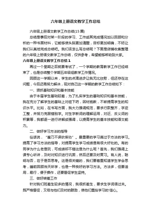 文档下载后可定制修改,请根据实际需要进行调整和使用,谢谢!并且,本店铺为大家提供各种类型的经典范文,如工作计划、工作总结、事迹材料、心得体会、调查报告、讲话致辞、条据文书、教学资料、作文大全、其他范文等等,想了解不同范文格式和写法,敬请关注!Download tips: This document is carefully compiled by this editor. I hope that after you download it, it can help you solve practical problems. The document can be customized and modified after downloading, please adjust and use it according to actual needs, thank you!Moreover, our store provides various types of classic sample essays for everyone, such as work plans, work summaries, historical materials, insights, investigation reports, speeches, documentary evidence, teaching materials, essay summaries, other sample essays, and more. If you want to learn about different sample essay formats and writing methods, please stay tuned!六年级语文上期教学工作总结5篇通过优秀的工作总结,我们可以发现自己在工作中的价值和贡献,写工作总结是对工作中的问题解决和决策能力的总结和反思,以下是本店铺精心为您推荐的六年级语文上期教学工作总结5篇,供大家参考。