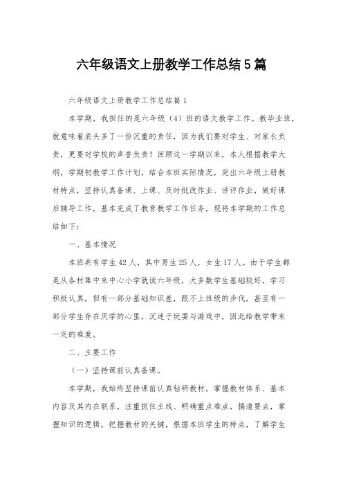 六年级语文上册教学工作总结5篇六年级语文上册教学工作总结篇1本学期,我担任的是六年级(4)班的语文教学工作。