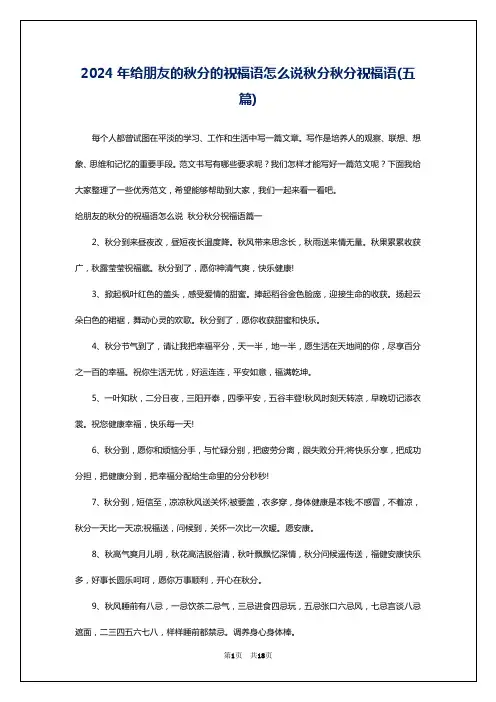 文档下载后可定制修改,请根据实际需要进行调整和使用,谢谢!并且,本店铺为大家提供各种类型的经典范文,如工作计划、工作总结、合同协议、条据书信、规章制度、应急预案、策划方案、教学资料、作文大全、其他范文等等,想了解不同范文格式和写法,敬请关注!Download tips: This document is carefully compiled by this editor. I hope that after you download it, it can help you solve practical problems. The document can be customized and modified after downloading, please adjust and use it according to actual needs, thank you!Moreover, our store provides various types of classic sample essays, such as work plans, work summaries, contract agreements, document letters, rules and regulations, emergency plans, planning plans, teaching materials, complete essays, and other sample essays. If you want to learn about different sample formats and writing methods, please pay attention!秋分祝福语秋分祝福语(集合8篇)下面是本店铺收集的秋分祝福语(集合8篇)以供参阅。