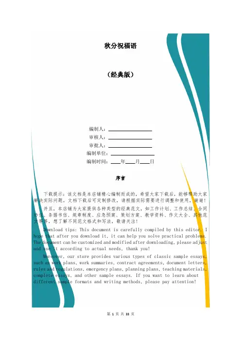 秋分祝福语(经典版)编制人:__________________审核人:__________________审批人:__________________编制单位:__________________编制时间:____年____月____日序言下载提示:该文档是本店铺精心编制而成的,希望大家下载后,能够帮助大家解决实际问题。