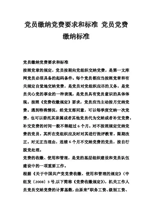 党员缴纳党费要求和标准党员党费缴纳标准党员缴纳党费要求和标准按照党章的规定,党员按期向党组织交纳党费,是第一文库网党员必须具备的起码条件。