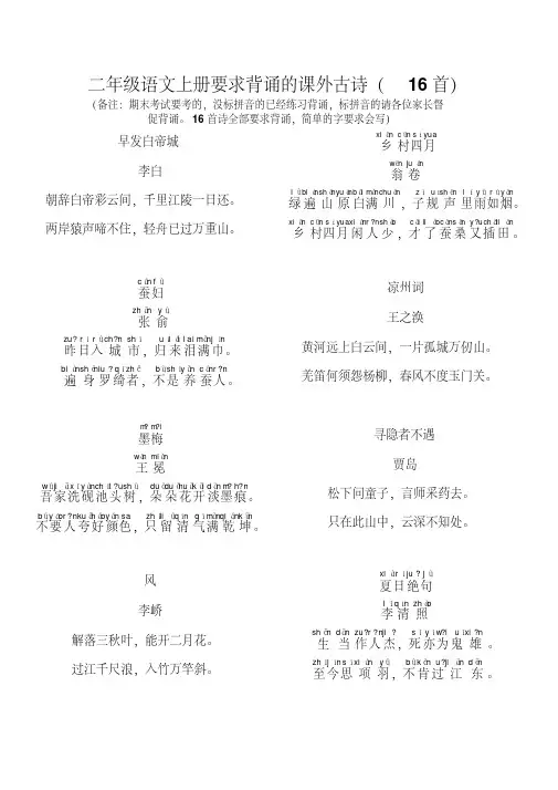 这些古诗词涵盖了自然风光、人文情感、哲理思考等多个方面,对于二年级学生来说,背诵这些诗词有助于培养他们对传统文化的热爱和对语言的敏感度。
