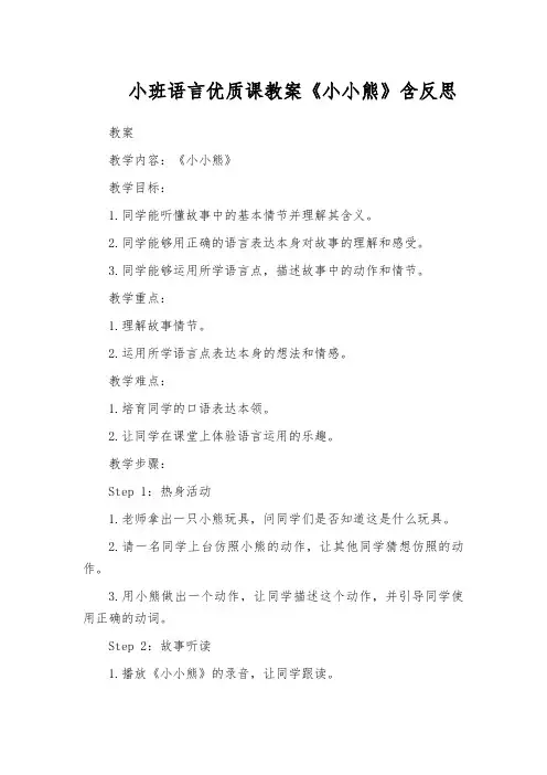 小班语言优质课教案及教学反思《小小熊》一、教案概述本节课是小班的一节语言优质课,教学内容为《小小熊》。