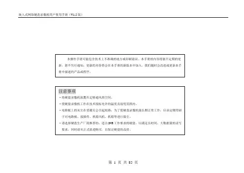 目录1 产品介绍 (5)1.1 产品概述 (5)1.2 产品主要功能 (5)2安装说明 (8)2.1 清点设备及其附件 (8)2.2 装上硬盘 (8)2.3 后面板物理接口说明 (9)2.3.1 HC、HT、HF后面板说明 (9)2.3.2 1/2/3/4路HC及2路HT设备的后面板说明 (10)2.3.3 HS、HTS设备的后面板说明 (11)2.4 报警线连接说明 (14)3 操作必读 (15)3.1前面板说明 (15)3.2 遥控器说明 (19)3.3 菜单项说明 (21)3.3.1 菜单导航 (21)3.3.2 菜单操作方法 (22)3.4 输入法说明 (23)4 基本操作指南 (24)4.1 开机 (24)4.2 预览 (24)4.3登录及修改用户名密码 (25)4.4 云台控制 (27)4.5手动录像 (28)4.6 回放 (29)4.7 录像资料备份 (32)4.8 语音对讲 (34)4.9 辅口输出控制 (34)4.10 关机 (35)5参数设置操作指南 (36)5.1 管理员及其密码 (36)5.2 创建与删除用户 (37)5.3 修改设备名称与设备号 (40)5.4 视频输出制式与VGA设置 (40)5.5 OSD设置 (41)5.6 视频输入参数设置 (43)5.7 区域遮盖设置 (44)5.8 遮挡报警处理 (45)5.9 视频丢失处理 (46)5.10 移动侦测处理 (48)5.11本地预览属性设置 (51)5.12录像参数及录像计划表 (53)5.13 报警输入输出设置 (57)5.14 网络参数 (60)5.15 解码器 (61)5.16 串口参数设置 (64)5.17 异常处理 (68)5.18 交易信息 (69)6 管理工具 (71)6.1保存设置 (71)6.2 恢复出厂设置 (72)6.3 升级 (72)6.4 硬盘管理 (72)6.5 清除报警 (72)6.6 重新启动 (72)6.7 关机 (73)6.8 日志 (73)6.8.1 按类型查询 (73)6.8.2按时间查询 (74)6.8.3按类型&时间查询 (74)6.9 查看系统信息 (74)7 网络硬盘录像机软件升级 (75)7.1配置FTP服务 (75)7.2 升级方式 (76)附录1、安装硬盘总容量的参考计算方法 (77)附录2 设备连接线的制作方法 (78)1 RS-485连接线制作方法 (78)2 UTP网络连接线制作方法 (78)3 RS-232连接线制作方法 (79)附录3 技术指标 (82)附录4 常用功能速查表 (83)附录5 常见故障解答 (85)1 产品介绍1.1 产品概述本设备是专为安防领域设计的一款优秀的数字监控产品。