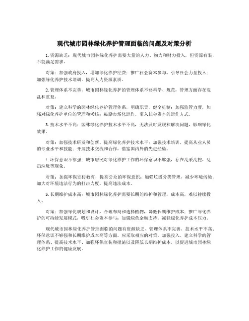 现代城市园林绿化养护管理面临的问题及对策分析随着城市化进程的加快和城市建设的发展,城市园林绿化养护管理面临着越来越多的问题。