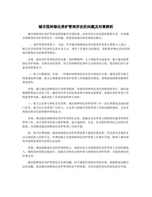 城市园林绿化养护管理存在的问题及对策随着城市化进程的加快,城市园林绿化在城市建设中扮演着越来越重要的角色。