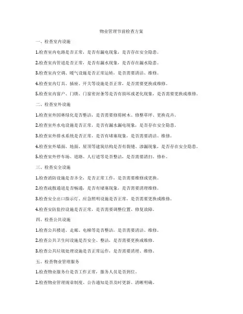 一、物业设施安全1. 确保物业设施(如电梯、空调系统、水管等)的正常运行。