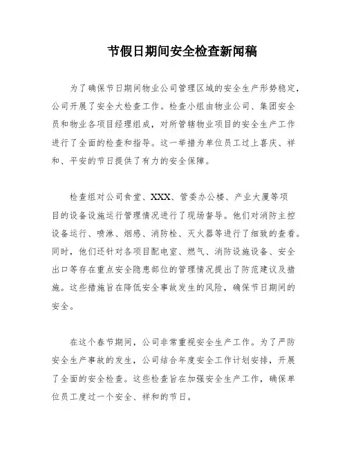 二、安全检查的重要性1. 人员流动增多带来的安全隐患节假日期间,小区内常常会有居民外出旅游、探亲访友等活动,人员流动增多。
