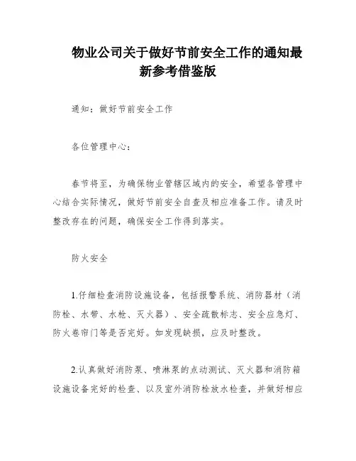 物业公司关于做好节前安全工作的通知最新参考借鉴版通知:做好节前安全工作各位管理中心:春节将至,为确保物业管辖区域内的安全,希望各管理中心结合实际情况,做好节前安全自查及相应准备工作。