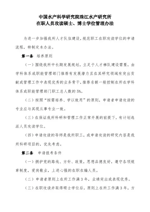 第三条审批程序(一)申请人填写《中国水产科学研究院珠江水产研究所在职人员攻读硕士、博士学位申请表》(附件1)。