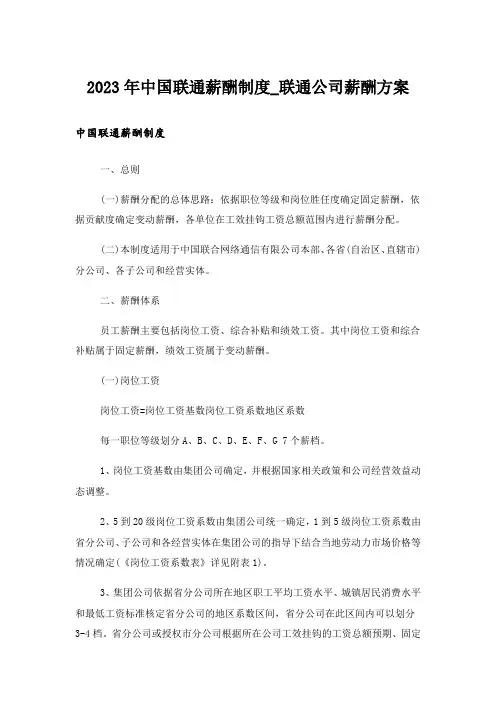2023年中国联通薪酬制度_联通公司薪酬方案中国联通薪酬制度一、总则(一)薪酬分配的总体思路:依据职位等级和岗位胜任度确定固定薪酬,依据贡献度确定变动薪酬,各单位在工效挂钩工资总额范围内进行薪酬分配。
