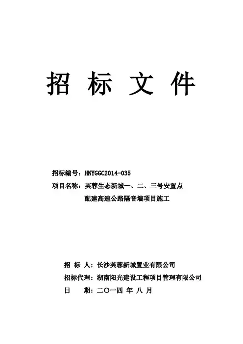 青城山国际度假社区豪雅青城住宅一期一批次公路声音屏障工程报价文件中建二局第三建筑工程有限公司成都分公司2016年1月24日一、公路声屏障报价表方案一、厚度8公分公路声屏障名称规格主要配置单位数量单价(元)合计(元)备注公路声屏障3500*80 颜色可以选择,高度3.5米厚度8公分含吸音屏障音效≤40bd㎡553 1450.00 801850.00 长158m高3.5m2.合计小写:¥718900.00元大写:人民币柒拾壹万捌仟玖佰元整注:1、以上价格含制作、保险、安装、税费、路政协调、检测等所有费用2、安装时间:双方协商。
