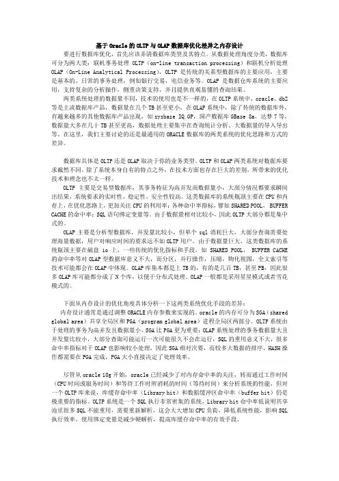 OLTP数据库优化方案及案例ORACLE数据库SQL优化方案、案例Edgar Liu© 2015 Huatek CO., LTD. All Rights Reserved.2015.3.17目录1. 优化方案与基础知识1.1 问题SQL来源(现象) 1.2 数据库性能优化方案及期待效果 1.3 优化方法论及优化分析树 1.4 数据库体系结构 1.5 逻辑读 逻辑写4.索引设计与查询条件4.1 4.2 4.3 4.4 索引介绍 索引设计步骤 索引创建原则 索引失效与不足2. 执行计划分析2.1 执行计划查看方法 2.2 执行计划示例 2.3 执行计划三部分 2.4 硬解析和软解析5. 高效SQL5.1 5.2 5.3 5.4 优化规则30条 关于Hit提示优化 DML语句优化 批量读取游标数据优化3.最佳表连接方式3.1 3.2 3.3 3.4 ORACLE表介绍 RDBMS表连接方式介绍 执行计划中表连接方式介绍 执行计划中表连接方式比较6. 数据模型与SQL6.1 数据逻辑模型设计 6.2 数据库物理设计 6.3 书集推荐2/401.0 OLTP 与OLAP区别•对于Oracle数据库的数据存取,主要有四个不同的调整级别, •第一级调整是操作系统级包括硬件平台, •第三级是Oracle数据库设计级的调整, 第二级调整是Oracle RDBMS级的调整, 第四级调整级是SQL级。