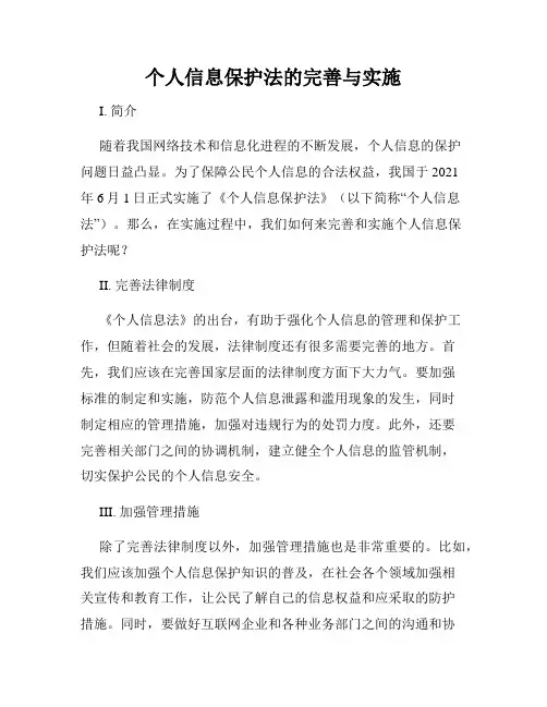 个人信息保护法的完善与实施I. 简介随着我国网络技术和信息化进程的不断发展,个人信息的保护问题日益凸显。