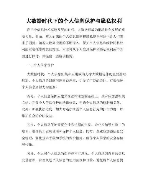 二、大数据时代个人信息的特点1. 多样性:大数据时代,个人信息的种类和形式变得更加多样化。