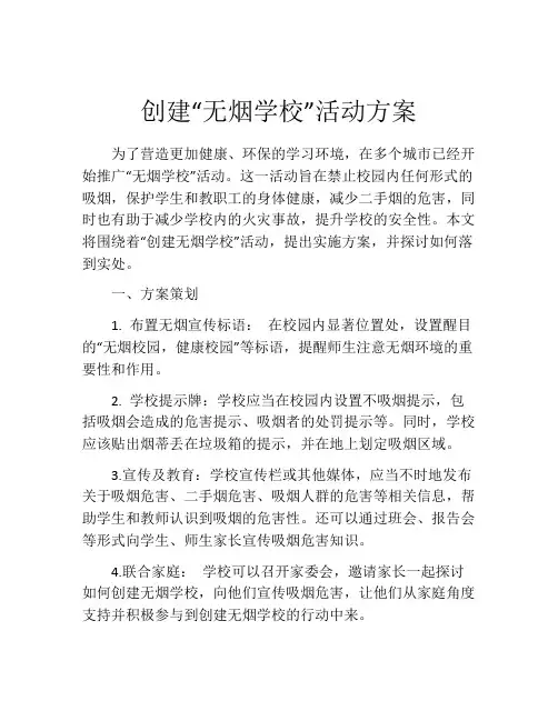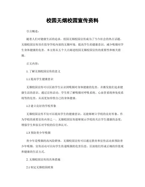 二、无烟政策宣传1. 无烟政策的制定学校应该制定明确的无烟政策,明确规定校园内禁止吸烟的区域和时间。