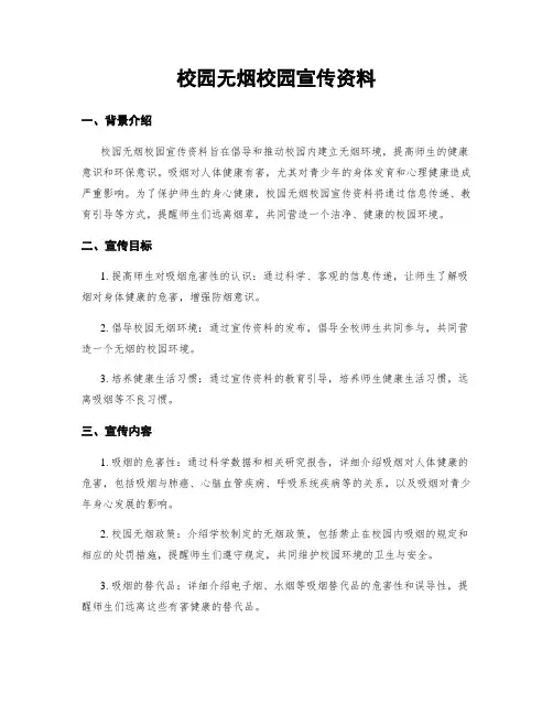 校园无烟校园宣传资料一、背景介绍校园无烟校园宣传资料旨在倡导和推动校园内建立无烟环境,提高师生的健康意识和环保意识。