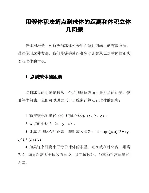 用等体积法解点到球体的距离和体积立体几何题等体积法是一种解决与球体相关的立体几何题目的有效方法。