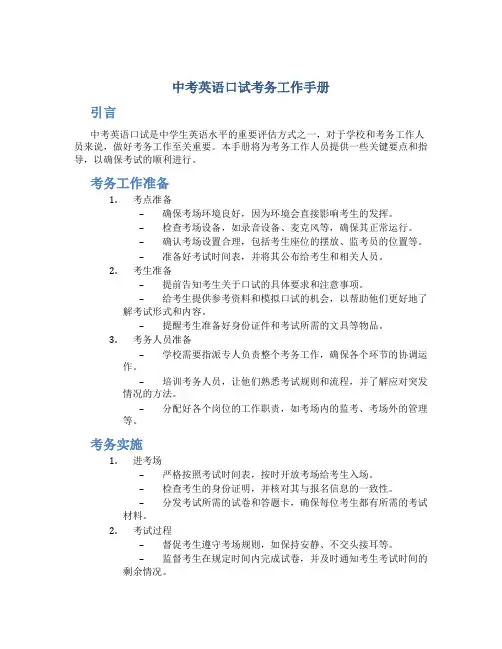 中考英语口试考务工作手册中考英语口试考务工作手册一、考务前的准备工作1. 阅读考试规则:在开始筹备考务工作之前,需认真阅读中考英语口试的考试规则和相关文件,了解考试的基本要求和流程。