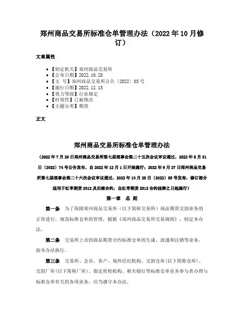 大连商品交易所标准仓单管理办法(2022修订)文章属性•【制定机关】大连商品交易所•【公布日期】2022.04.28•【文号】大连商品交易所公告〔2022〕30号•【施行日期】2022.04.28•【效力等级】行业规定•【时效性】现行有效•【主题分类】期货正文大连商品交易所标准仓单管理办法大连商品交易所公告〔2022〕30号第一章总则第一条为保障大连商品交易所(以下简称交易所)期货交割业务的正常进行,加强标准仓单管理,根据《大连商品交易所交易规则》制定本办法。