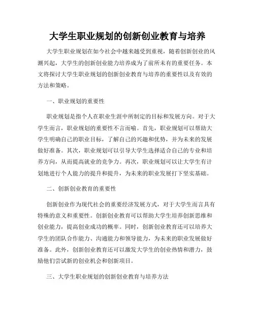 三、大学生职业规划的创新创业教育与培养方法1. 强化创新创业课程设置:大学应该加强对创新创业课程的设置,让学生在学校期间接触到创新创业的理论与实践,提高其创业意识和创新能力。