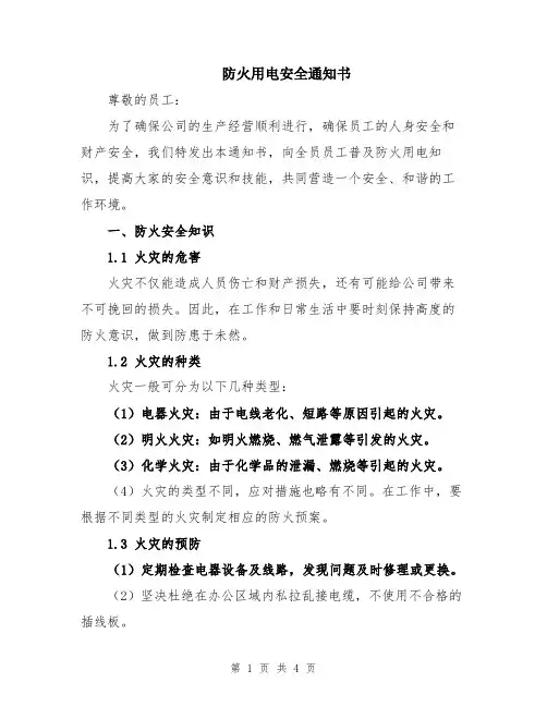 防火用电安全通知书尊敬的员工:为了确保公司的生产经营顺利进行,确保员工的人身安全和财产安全,我们特发出本通知书,向全员员工普及防火用电知识,提高大家的安全意识和技能,共同营造一个安全、和谐的工作环境。