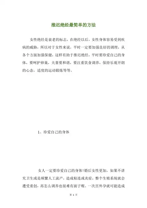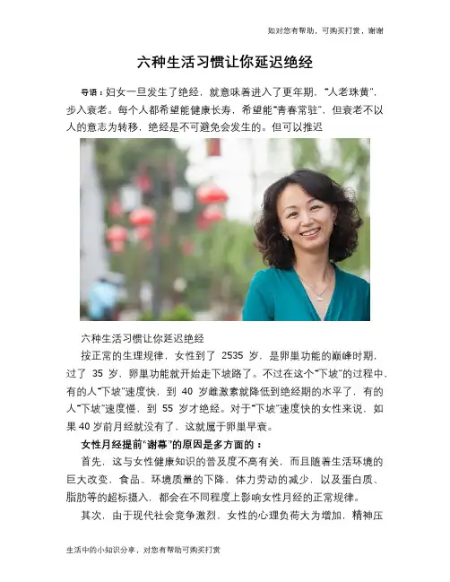 文章目录•一、怎样延缓绝经•二、什么人易提前绝经•三、绝经对身体有什么影响怎样延缓绝经1、怎样延缓绝经:保持夫妻生活和谐夫妻生活对于中年女性们来说,这是一种证明夫妻关系是否融洽的标志。
