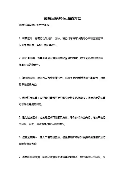2.3 定期运动适度的运动是预防提前闭经的重要因素之一:•增加有氧运动:做有氧运动,如快走、慢跑、游泳等,可提高身体的新陈代谢并促进荷尔蒙的正常分泌。