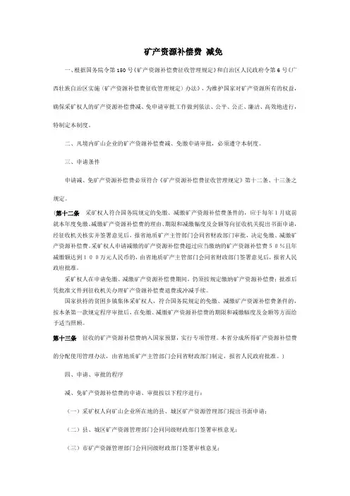 矿产资源补偿费减免一、根据国务院令第150号《矿产资源补偿费征收管理规定》和自治区人民政府令第6号《广西壮族自治区实施〈矿产资源补偿费征收管理规定〉办法》,为维护国家对矿产资源所有的权益,确保采矿权人的矿产资源补偿费减、免申请审批工作做到依法、公平、公正、廉洁、高效地进行,特制定本制度。