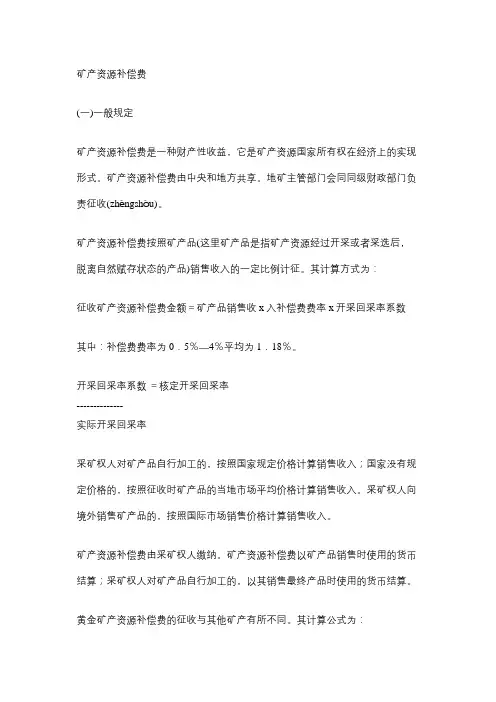 矿产资源补偿费征收管理规定2篇第一篇:矿产资源补偿费征收管理规定一、总则为规范矿产资源补偿费征收管理,保护矿产资源,维护矿区环境,根据《中华人民共和国矿藏资源法》、《中华人民共和国环境保护法》及有关法律法规,制定本规定。