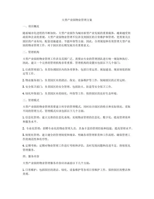 大型产业园物业管理方案一、项目概况随着城市化进程的不断加快,大型产业园作为城市新型产业发展的重要载体,越来越受到政府和企业的重视。