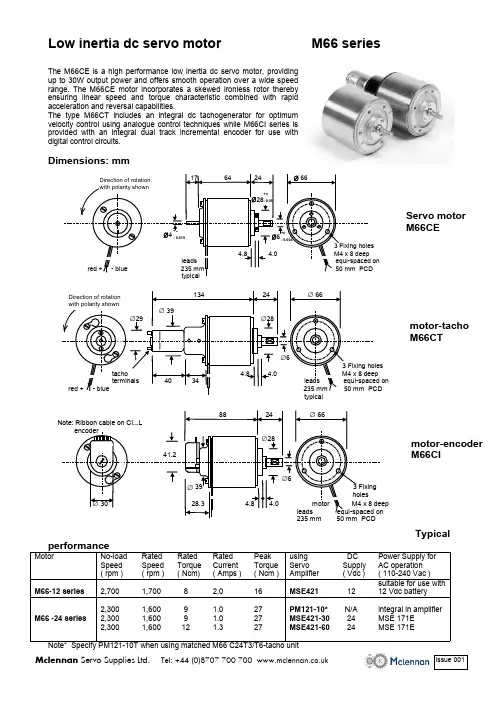 Low inertia dc servo motor M66 seriesThe M66CE is a high performance low inertia dc servo motor, providing up to 30W output power and offers smooth operation over a wide speed range. The M66CE motor incorporates a skewed ironless rotor thereby ensuring linear speed and torque characteristic combined with rapid acceleration and reversal capabilities.The type M66CT includes an integral dc tachogenerator for optimum velocity control using analogue control techniques while M66CI series is provided with an integral dual track incremental encoder for use with digital control circuits.Dimensions: mmTypicalperformanceMotorNo-load Speed ( rpm )Rated Speed ( rpm )Rated Torque ( Ncm)Rated Current ( Amps )Peak Torque ( Ncm )using Servo Amplifier DC Supply ( Vdc )Power Supply for AC operation ( 110-240 Vac )M66-12 series 2,7001,700 8 2.016MSE421 12suitable for use with 12 Vdc battery 2,3001,600 9 1.027PM121-10* N/A integral in amplifier 2,3001,600 9 1.027MSE421-30 24MSE 171E M66 -24 series2,3001,600121.327MSE421-6024MSE 171ENote* Specify PM121-10T when using matched M66 C24T3/T6-tacho unitmotor-tacho M66CTmotor-encoder M66CIMclennan Servo Supplies Ltd. Tel: +44 (0)8707 700 700 30 Watt Ironless rotor dc servo motor M66 series Specification dc servo motor type M66CEmotor-tacho versions M66CT seriesmotor-encoder version M66-CI...seriestypes: M66CI ...T-12M66CI ...T-24M66CI ...L-12M66CI ...L-24Nominal Voltage 12Vdc24VdcMotor specification: As aboveEncoder type CI...T CI...LSupply Vdc 5 + 0.5 5 + 0.5Max. Output signal Vdc 5 5Signal wave form Square SquareOutput Circuit TTL RS 422Output Configuration Dual TrackQuadrature Dual Track + Index ( complementary )Number of Lines 100 or 500 100 or 500Note:M66 servo motors are also available with an integral parking brake ( M66DB )If a parking brake is required please contact us for full specification of M66DB optionsMclennan Servo Supplies Ltd.Tel: +44 (0)8707 700 700 The M66DB is a low inertia, ironless rotor dc servo motor which is equipped with a ‘power-off’ parking brake to provide a static holding torque to resist movement under unbalanced load conditions when the motor/brake assembly is de-energised. Additionally the brake may be used in dynamic conditions to arrest motion although increased wear will then occur.When the brake is energised the motor is free to rotate and may be controlled to provide a very wide speed range with minimal cogging, even at low speed, due to it’s ironless rotor construction.The motor is equipped with long-life carbon brushes which are suitable for electronic speed control by either linear or PWM servo amplifier systems.Brake specificationNominal Operating Voltage ( Vdc ) 12 24Operating Current ( Amps ) < 0.50 0.22Min. Pull-in voltage ( Vdc ) < 10 18Max. Drop-out voltage ( Vdc ) > 6 8Holding Torque, de-energised ( Ncm )1010Assembly order codeStandard voltage optionsM66DB-12M66DB-24Mclennan Servo Supplies Ltd. Tel: +44 (0)8707 700 700 Special Versions:In some cases it may be preferred to utilise a 24 Vdc version of the servo motorwith 12 Volt rated brake and visa versa.In these case the following special part numbers should be used:Specification: Special modelsBrake specificationNominal Brake Voltage ( Vdc ) 24 12 Operating Current ( Amps ) 0.22 < 0.50 Min. Pull-in voltage ( Vdc ) 18 < 10 Max. Drop-out voltage ( Vdc ) 8 > 6 Holding Torque, de-energised ( Ncm ) 10 10Mclennan Servo Supplies Ltd.Tel: +44 (0)8707 700 700 。