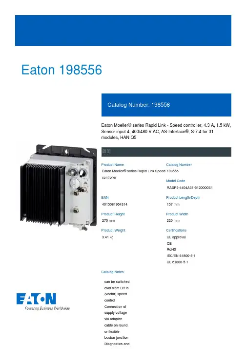 Eaton 198556Eaton Moeller® series Rapid Link - Speed controller, 4.3 A, 1.5 kW, Sensor input 4, 400/480 V AC, AS-Interface®, S-7.4 for 31 modules, HAN Q5Eaton Moeller® series Rapid Link Speed controller198556RASP5-4404A31-5120000S14015081964314157 mm 270 mm 220 mm 3.41 kgUL approval CE RoHSIEC/EN 61800-5-1 UL 61800-5-1Product NameCatalog NumberModel CodeEANProduct Length/Depth Product Height Product Width Product Weight Certifications Catalog Notes can be switched over from U/f to (vector) speed control Connection of supply voltage via adapter cable on round or flexible busbar junction Diagnostics andParameterization: drivesConnectDiagnostics and reset on device and via AS-Interface Parameterization: FieldbusParameterization: KeypadParameterization: drivesConnect mobile (App)Internal DC linkPC connectionKey switch position AUTOSelector switch (Positions: REV - OFF - FWD)Two sensor inputs through M12 sockets (max. 150 mA) for quick stop and interlocked manual operationThermo-click with safe isolationKey switch position OFF/RESETKey switch position HANDPTC thermistor monitoringFour fixed speedsIGBT inverterControl unitFor actuation of motors with mechanical brake IP65NEMA 121st and 2nd environments (according to EN 61800-3)IIISpeed controllerAS-Interface profile cable: S-7.4 for 31 modulesASIC1: for conducted emissions onlyC2, C3: depending on the motor cable length, the connected load, and ambient conditions. External radio interference suppression filters (optional) may be necessary.2000 VCenter-point earthed star network (TN-S network)AC voltagePhase-earthed AC supply systems are not permitted.Vertical15 g, Mechanical, According to IEC/EN 60068-2-27, 11 ms, Half-sinusoidal shock 11 ms, 1000 shocks per shaftResistance: According to IEC/EN 60068-2-6Resistance: 57 Hz, Amplitude transition frequency on accelerationResistance: 10 - 150 Hz, Oscillation frequencyResistance: 6 Hz, Amplitude 0.15 mm Max. 2000 mAbove 1000 m with 1 % performance reduction per 100 m -10 °C40 °C-40 °C70 °CFeatures Fitted with:Functions Degree of protectionElectromagnetic compatibility Overvoltage categoryProduct categoryProtocolRadio interference classRated impulse withstand voltage (Uimp) System configuration typeMounting position Shock resistance Vibration AltitudeAmbient operating temperature - min Ambient operating temperature - max Ambient storage temperature - min Ambient storage temperature - max< 95 %, no condensation In accordance with IEC/EN 50178Adjustable, motor, main circuit 0.4 - 4.3 A, motor, main circuit < 10 ms, Off-delay < 10 ms, On-delay 98 % (η)4.1 A3.5 mA120 %Maximum of one time every 60 seconds 380 V480 V380 - 480 V (-10 %/+10 %, at 50/60 Hz)U/f control BLDC motorsSensorless vector control (SLV) Synchronous reluctance motors PM and LSPM motors 0 Hz500 HzFor 60 s every 600 s At 40 °C6.5 AClimatic proofingCurrent limitationDelay timeEfficiency Input current ILN at 150% overload Leakage current at ground IPE - max Mains current distortion Mains switch-on frequencyMains voltage - min Mains voltage - max Mains voltage toleranceOperating mode Output frequency - min Output frequency - max Overload current Overload current IL at 150% overload45 Hz66 Hz4.3 A at 150% overload (at an operating frequency of 8 kHz and an ambient air temperature of +40 °C)1.5 kW480 V AC, 3-phase400 V AC, 3-phase0.1 Hz (Frequency resolution, setpoint value)200 %, IH, max. starting current (High Overload), For 2 seconds every 20 seconds, Power section50/60 Hz8 kHz, 4 - 32 kHz adjustable, fPWM, Power section, Main circuitCenter-point earthed star network (TN-S network)AC voltagePhase-earthed AC supply systems are not permitted.2 HP≤ 0.6 A (max. 6 A for 120 ms), Actuator for external motor brake≤ 30 % (I/Ie)Adjustable to 100 % (I/Ie), DC - Main circuit400/480 V AC -15 % / +10 %, Actuator for external motor brake10 kAType 1 coordination via the power bus' feeder unit, Main circuit24 V DC (-15 %/+20 %, external via AS-Interface® plug)400/480 V AC (external brake 50/60 Hz)AS-InterfacePlug type: HAN Q5Max. total power consumption from AS-Interface® power supply unit (30 V): 190 mANumber of slave addresses: 31 (AS-Interface®) Specification: S-7.4 (AS-Interface®)C2 ≤ 5 m, maximum motor cable length C1 ≤ 1 m, maximum motor cable length C3 ≤ 25 m, maximum motor cable lengthMeets the product standard's requirements.Rated frequency - minRated frequency - maxRated operational current (Ie)Rated operational power at 380/400 V, 50 Hz, 3-phase Rated operational voltageResolutionStarting current - maxSupply frequencySwitching frequencySystem configuration type Assigned motor power at 460/480 V, 60 Hz, 3-phase Braking currentBraking torqueBraking voltageRated conditional short-circuit current (Iq)Short-circuit protection (external output circuits) Rated control voltage (Uc)Communication interfaceConnectionInterfacesCable length10.2.2 Corrosion resistanceMeets the product standard's requirements.Meets the product standard's requirements.Meets the product standard's requirements.Meets the product standard's requirements.Does not apply, since the entire switchgear needs to be evaluated.Does not apply, since the entire switchgear needs to be evaluated.Meets the product standard's requirements.Does not apply, since the entire switchgear needs to be evaluated.Meets the product standard's requirements.Does not apply, since the entire switchgear needs to be evaluated.Does not apply, since the entire switchgear needs to be evaluated.Is the panel builder's responsibility.Is the panel builder's responsibility.Is the panel builder's responsibility.Is the panel builder's responsibility.Is the panel builder's responsibility.ETN.RASP5-4404A31-5120000S1.edzramo5_v19.dwgrasp5_v19.stpeaton-bus-adapter-rapidlink-speed-controller-dimensions-003.eps eaton-bus-adapter-rapidlink-speed-controller-dimensions-002.eps eaton-bus-adapter-rapidlink-speed-controller-dimensions-004.eps eaton-bus-adapter-rapidlink-speed-controller-dimensions.epsRapid Lin