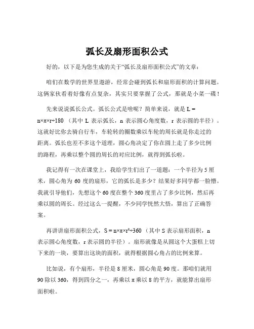 弧长及扇形面积计算公式弧长计算公式:弧长是圆的一部分的弧所占据的长度。