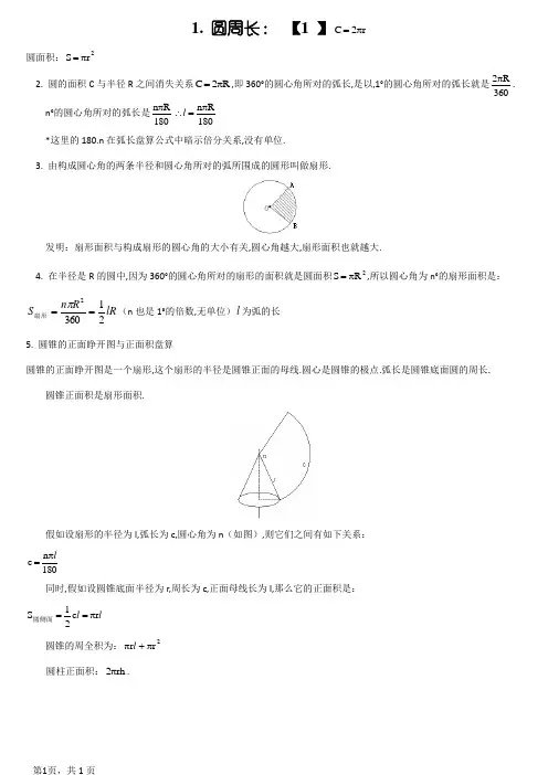 13602==π扇形(n 也是1°的倍数,无单位)l 为弧的长 5. 圆锥的正面睁开图与正面积盘算