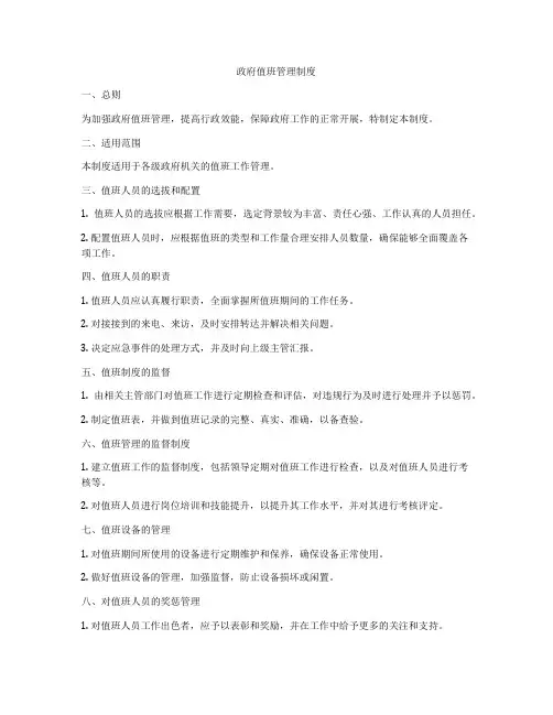 政府值班管理制度一、总则为加强政府值班管理,提高行政效能,保障政府工作的正常开展,特制定本制度。