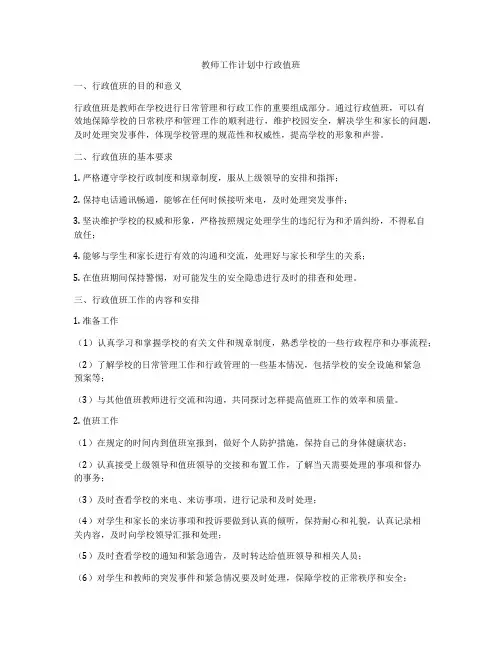 教师工作计划中行政值班一、行政值班的目的和意义行政值班是教师在学校进行日常管理和行政工作的重要组成部分。
