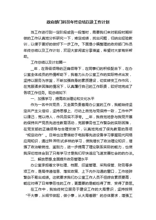 政府部门科员年终总结以及工作计划当工作进行到一定阶段或告一段落时,需要我们来对前段时期所做的工作认真地分析研究一下,肯定成绩,找出问题,归纳出经验教训,以便于更好的做好下一步工作。