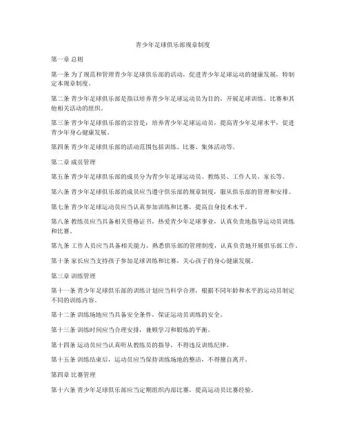 青少年足球俱乐部规章制度第一章总则第一条为了规范和管理青少年足球俱乐部的活动,促进青少年足球运动的健康发展,特制定本规章制度。