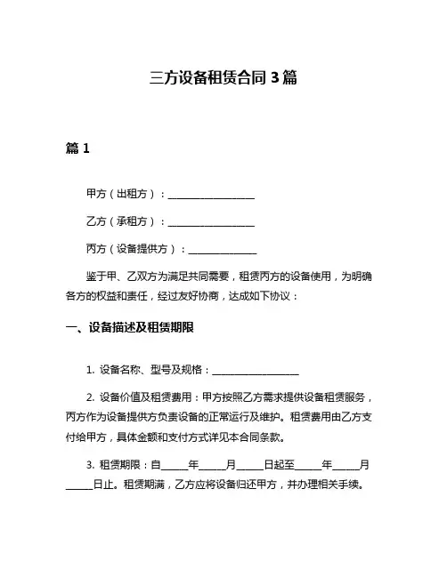 三方设备租赁合同3篇篇1甲方(出租方):___________________乙方(承租方):___________________丙方(设备提供方):_______________鉴于甲、乙双方为满足共同需要,租赁丙方的设备使用,为明确各方的权益和责任,经过友好协商,达成如下协议:一、设备描述及租赁期限1. 设备名称、型号及规格:___________________2. 设备价值及租赁费用:甲方按照乙方需求提供设备租赁服务,丙方作为设备提供方负责设备的正常运行及维护。