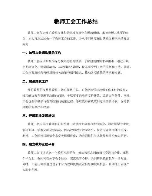 三、开展丰富多彩的活动,增强凝聚力为了增强学校的凝聚力,学校工会在工作中积极开展丰富多彩的活动。