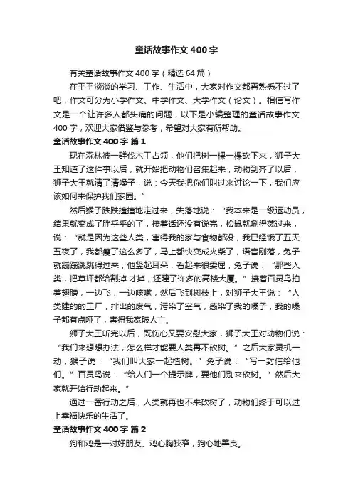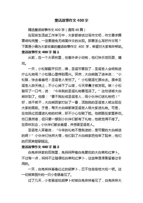 写童话作文400字优秀5篇(实用版)编制人:__________________审核人:__________________审批人:__________________编制单位:__________________编制时间:____年____月____日序言下载提示:该文档是本店铺精心编制而成的,希望大家下载后,能够帮助大家解决实际问题。