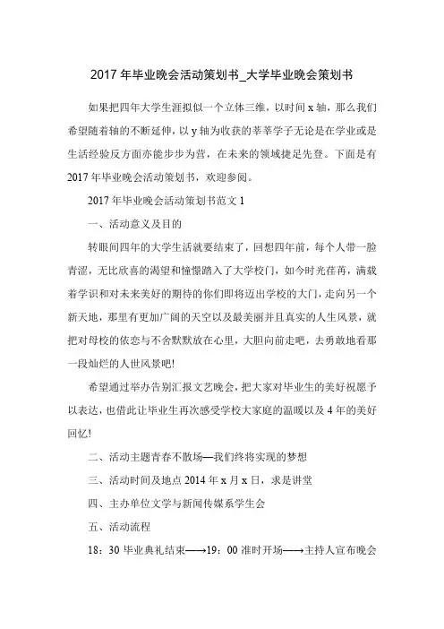 2017年毕业晚会活动策划书范文1一、活动意义及目的转眼间四年的大学生活就要结束了,回想四年前,每个人带一脸青涩,无比欣喜的渴望和憧憬踏入了大学校门,如今时光荏苒,满载着学识和对未来美好的期待的你们即将迈出学校的大门,走向另一个新天地,那里有更加广阔的天空以及最美丽并且真实的人生风景,就把对母校的依恋与不舍默默放在心里,大胆向前走吧,去勇敢地看那一段灿烂的人世风景吧!希望通过举办告别汇报文艺晚会,把大家对毕业生的美好祝愿予以表达,也借此让毕业生再次感受学校大家庭的温暖以及4年的美好回忆!二、活动主题青春不散场—我们终将实现的梦想三、活动时间及地点2014年x月x日,求是讲堂四、主办单位文学与新闻传媒系学生会五、活动流程18:30毕业典礼结束—→19:00准时开场—→主持人宣布晚会开幕—→短片播放—→节目演出—→主持人宣读晚会闭幕词—→大合唱和照相留念—→观众退场六、活动具体安排毕业晚会具体内容由鲁迅的名著来区分大学的四个阶段:《彷徨》、《呐喊》、《朝花夕拾》、《祝福》。